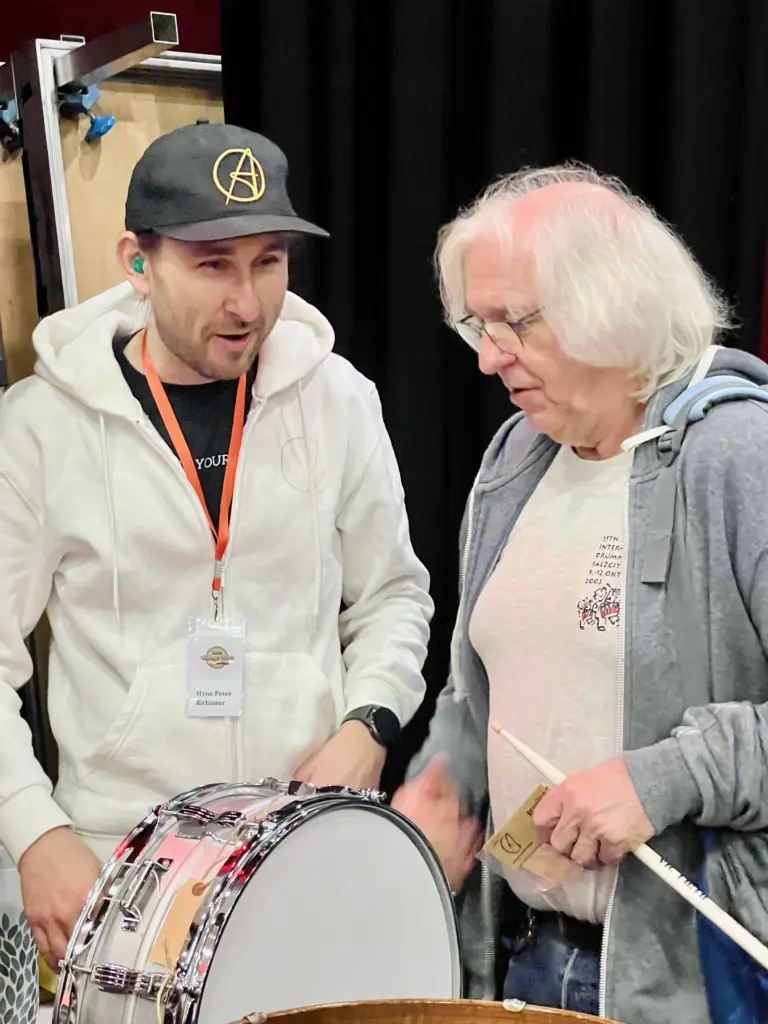 From my collection: I also brought a few favorites —this year a Slingerland Rolling Bomber snare, a Radio King snare, an A&F Raw Brass 6.5×14“ and a Craviotto Birdseye Maple 5.5×14“ snare. Three voices, three eras, and a nice A/B/C playground for comparing how calfskin changes the attack, sustain, and feel.