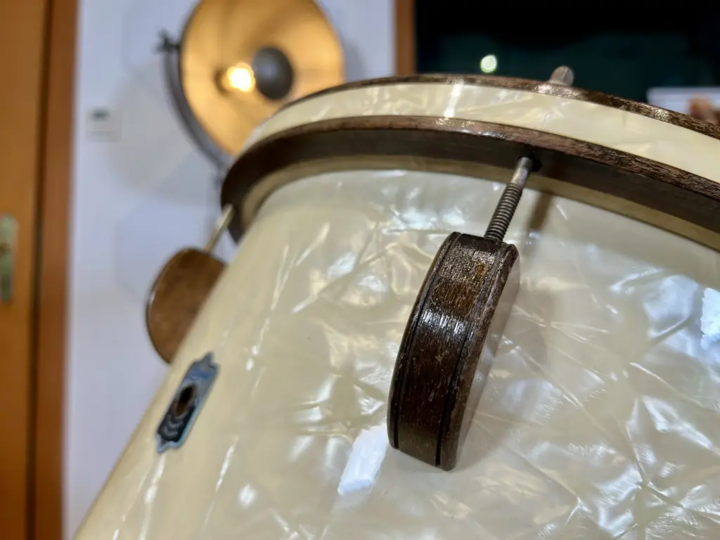 If you’ve already read my article on Slingerland’s Rolling Bomber here on the blog, you’ve seen how Slingerland solved this problem with heavily wooden hardware. The Leedy Dreadnaught sits in exactly the same historical window – Leedy’s own interpretation of a mostly wooden, fully professional wartime drum.