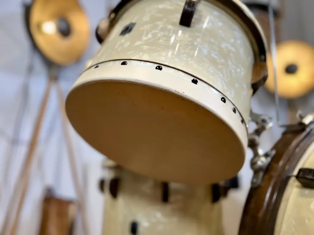 All drums still wear their original calfskin heads, which is unusual and a big part of why this set feels like a time capsule.